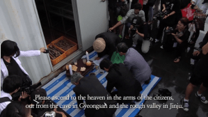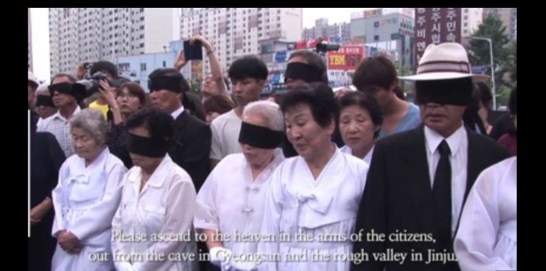 In contrast to the official aesthetics, the Gwangju Biennale, founded in 1995, is aimed to commemorate the pro-democracy protest and massacre now known as the Gwangju Uprising.[18] In the 10th Biennale in 2014 South Korean artist Minouk Lim presented her work Navigation ID together with the widows and descendants of the victims of several overshadowed Korean War massacres. The artist revealed the fact the Korean state and society would rather forget that, during the dictatorial era, the South Korean government had killed more than 100,000 suspected communists and other political opponents. To remind the public the unacknowledged deaths for decades, the artist presented the bones of the victims at the opening of the biennial. Planned like a ceremonial process, the trailers carrying the bones arrived the scene, escorted by a helicopter. Family members in mourning clothes and blindfolds proceeded to place offerings around the remains.[19] Lim’s art not only reminds people the cruelty of the dictatorial regime, but also challenges the legitimacy of the heroism that the official policy utilizes to strengthen South Korea people’s identity with the state (Figure 10).