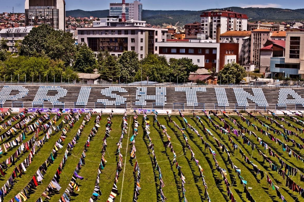 To intervene the collective memory of being in peace, Alketa Xhafa-Mripa, a Kosovo-born British artist showed her work Thinking of You in June 2015 with 5,000 dresses stretched on clotheslines across a football field in Kosovo’s capital Pristina (Figure 11). The dresses were donated in response to the artist’s call that 16 years after the war, the sexual violence during the war has never been dealt. It is estimated about 20,000 Albanian women, and some men, were victims of sexual violence during the Kosovo war (1998–1999), caused by Albanian separatists fighting against the Yugoslav regime led by Serbian Slobodan Milosevic. Some of the victims who have spoken out faced criticism and were expelled by conservatives in Kosovo, mainly Muslim Albanians. Many women who had been raped during the chaos were later divorced by their husbands. With Anna Di Lellio, an Italian expert of international affairs in Kosovo, Alketa Xhafa-Mripa has implemented her concept as a powerful visual reminder of an aspect of the Kosovo War that is seldom faced and discussed (Booth 2015).