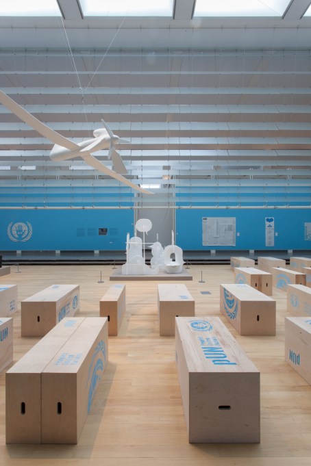 Perusing several websites, databases and catalogues makes evident that the involvement of artists with the UN is only occasional and mostly indirect. Indeed, the number of artworks that can be found dealing explicitly with it is very low—which perhaps reflects the complexity of the organisation.[4] PUN, developed by the Mexican artist Pedro Reyes, is among the rare examples of an artistic engagement with this international organisation. It was presented at Performa 13, a biannual performance art festival staged in the Queens Museum, New York, and comprised an exhibition (on view from 9 November, 2013 to 30 March, 2014) and a performance (taking place at midday 23–24 November, 2013) (Reyes, 2013b). Reyes, born in 1972, lives and works in Mexico, and has participated in group exhibitions such as dOCUMENTA(13) in Kassel. He has risen to international attention with projects such as Palas por Pistolas (Guns for Shovels) (2008), in which the artist took guns from the Mexican drugs war, melted them down and re-cast the metal as shovels. A prolific artist, Reyes has had solo exhibitions namely at Creative Time, New York, USA (2016); Dallas Contemporary, Texas, USA (2016); The Power Plant, Toronto, Canada (2014); Walker Art Center, Minneapolis, MN, USA (2011); Guggenheim Museum, New York, USA (2011) and his group exhibitions include The National Museum of XXI Century Arts (MAXXI), Rome (2015); Beijing Biennale, China (2014); dOCUMENTA (13), Kassel, Germany (2012); Liverpool Biennial, UK (2012); Gwangju Biennial, South Korea (2012) and the 50th Venice Biennale, Italy (2003).
