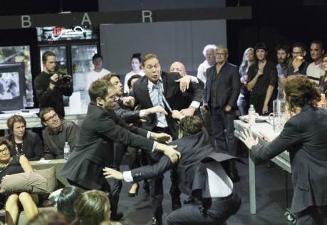 Van Hove, though, is more radical when it comes to the audience, looking always to express things in the most extreme way for impact. In his magnificent epic Roman Tragedies (Shakespeare’s Coriolanus, Julius Caesar and Anthony and Cleopatra all rolled into one), he cut all the citizen scenes, but effectively recreated the citizenry by allowing the audience to roam on and off the stage, witnessing the action from close-up, framing it and populating it. His theory is based on thoughts on the changing nature of theatre spaces—from open air ten thousand capacity arenas in Greece, to semi open in Shakespeare’s day, to semi-private in the nineteenth century, to darkness and individual privacy today. He’s, in effect, trying to open it up again …. a theatrical/architectural response, I think to attempt to increase the power—or the communal empathy.
