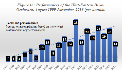 As previous research in cultural diplomacy has already considered from a best-practice viewpoint, distance from political and economic agendas (that is to say sufficient integrity in public opinion) together with a high level of interaction with the target audience and long-term commitment independent from ad hoc crisis management seem more likely to be successful (Gienow-Hecht 2010; Goff 2013). Against this background, the orchestra’s extraordinary and long-lasting success can also be attributed to two decisive structural developments: a general evolution toward professionalization (not alone thanks to the standardization of audition procedures from 2003 onwards) and institutionalization. Nearly two decades after the launch of the WEDO as a one-time workshop in 1999, Barenboim drew a positive summary in relation to his and Edward Said’s initial goals: “At the very beginning, more than 60 percent of its musicians had never played in an orchestra. Today, it is recognized as one of the leading orchestras in the world. Musically, it’s much better than we’ve ever dreamed of” (Bourdais 2018). Barenboim himself dated the audible result of this first artistic development boost to 2007, when the Divan musicians were able to perform Arnold Schönberg’s tremendously demanding Variationen opus 31 (the first 12-tone work Schönberg composed for larger ensemble) after 22 rehearsals in Salzburg and eventually got highest appraisal by Pierre Boulez. In addition, the WEDO differs from every other conventional youth orchestra not only in its specific humanistic claim and the related political implications to encourage the participation of people from nations that are intertwined by mutual enmity, but also with regard to its organizational concept itself. Since the very first workshop in 1999, Axel Wilczok (concertmaster of the Staatskapelle Berlin from 1984 until his early death in 2018 and professor at the Rostock Musikhochschule), Matthias Glander (principal clarinettist of the same orchestra), and the conductor Tabaré Perlas (Barenboim’s project assistant in Weimar 1999, CEO of the Daniel Barenboim Stiftung since 2008) supported Barenboim by realizing separate rehearsals for the string and wind sections as well as by conducting the demanding in-site auditions for new musicians (see Cheah 2009:51–65). That said, the institutional consolidation was strongly driven by pioneer spirit and personal commitment; study grants and long-term tutorship, often unpaid and mostly performed by members of the Staatskapelle Berlin, the Berlin Philharmonic, or the Chicago Symphony Orchestra (where the third workshop was taking place in 2001), are exceeding the actual project phases. The growing professionalization is reflected not least in a significant increase in the annual performance activities, as the following diagram (Figure 1a) illustrates: