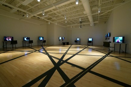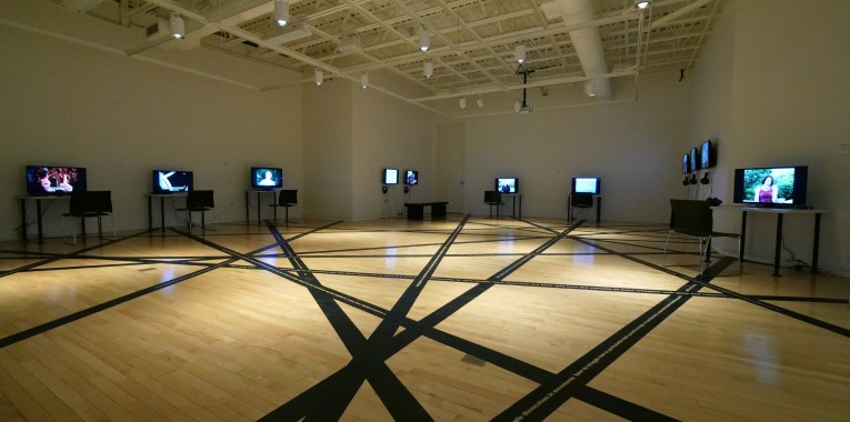 Figures 3 and 4. Oliver Ressler, “Alternative Economics, Alternative Societies,” 16-channel video installation, 2003–2008 (Installation view: Bush Art Center Galleries, St. Norbert College, De Pere, WI, 2018; photo: Oliver Ressler).