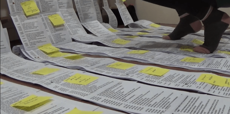 The sensuous, affective dimension of data analysis is quite prominent in the video. For example, the data needs to be visualised in order to be coded, while the materiality of the data on paper surrounding you in the room is further intensified by its aural presence––as you say “The narrative…is buzzing…vibrating.” This is not something that is covered in grounded theory. Can you comment on this feature?