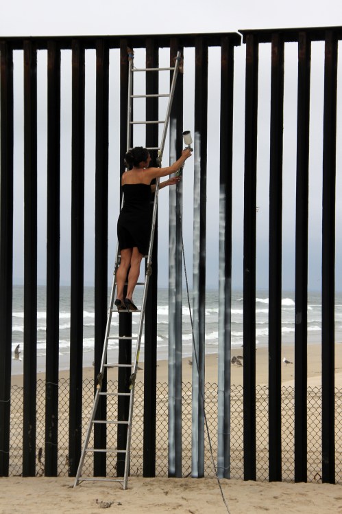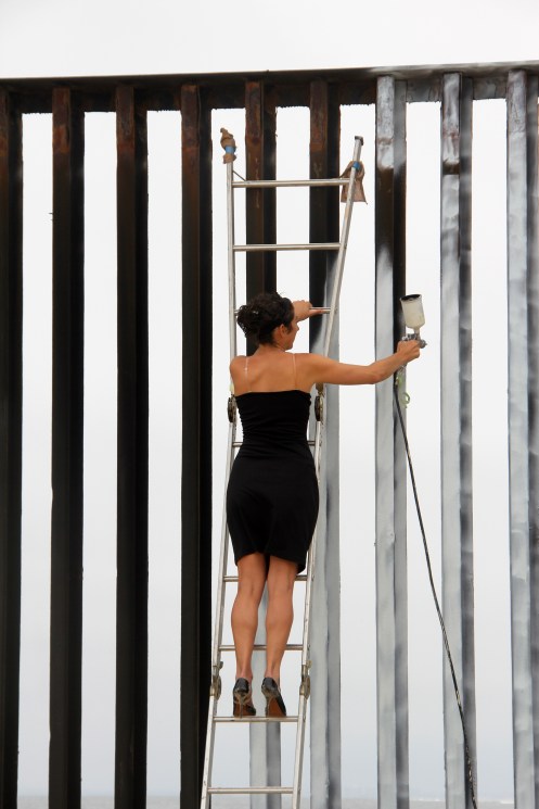 On a Tuesday in June 2011, artist Ana Teresa Fernández[19] erased the US–Mexican border at Tijuana (see Figure 3). She did so in a black cocktail dress and spike heels, using Martha Stewart Living light blue exterior paint number MSL 5011 (Fernandez 2011; Holslin 2011; Trimble 2015). She had a little help from a couple of friends and in a later similar performance at the Nogales border, help from more friends. With the performance, the physical act of painting and the resulting vista in which the painted barrier seems to disappear into the sky, she is communicating powerfully about this territorial border (US–Mexico). Her attire and persona (climbing the ladder in a cocktail dress and heels) disrupt social boundaries (between men and women, between classes, etc.). Despite the blue paint and transgressive clothing, the border fence still exists. Anyone coming up to it will still see metal bars that (are intended to) limit the flow of migrants into the United States.