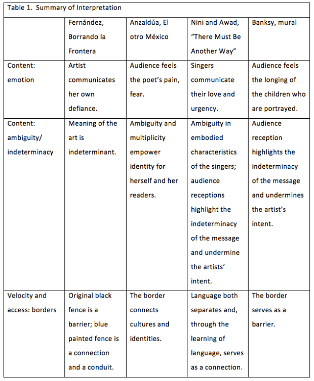 Fernandez, Borrando la Frontera (2011); Anzaldúa, El otro México (2007); Nini [Noa][18] and Awad, There Must Be Another Way (Eurovision Song Contest 2009); and Banksy, untitled grafitto (Ortner and Banksy 2005) are, respectively, a performance of painting and an essay and poem, both contesting the US–Mexico border; and the performance of a song and a mural by a famous graffiti artist, both contesting the Israel–Palestine border. The works are done in different media, and the specific nature of the contestations varies. Nevertheless, each of these works of art is an instance of art power, as the art itself (the content), the velocity of the information, and access to the information are manipulated by the artist to make the border a site of political critique. Each of the works tells a story about the border, a story in which negative emotions for current situations hint at potential for transformation for, to use the words of Nini and Awad, “a better way.”