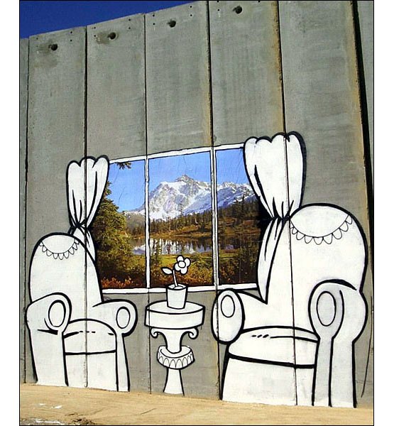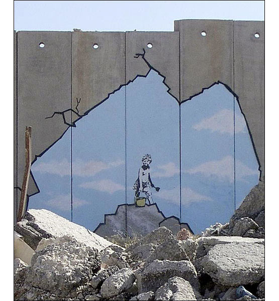 Since the First Intifada, however, there have been changes in the urban art in Palestine. In the 1980s, the most common expressions were drawings and words that did not intend to be visually pleasant, only to send specific messages. The urban art present today in the West Bank Wall still has much of political graffiti, but also a lot of street art and murals[3], and that change has to do with the presence of a very famous urban artist: Banksy. In 2005, the artist visited places such as Bethlehem and Abu Dis, cities that have been impacted by the construction of the wall, and created nine big murals, all of which depicted the need to go through or destroy the barrier[4]. Examples of his work on the Wall can be found below.