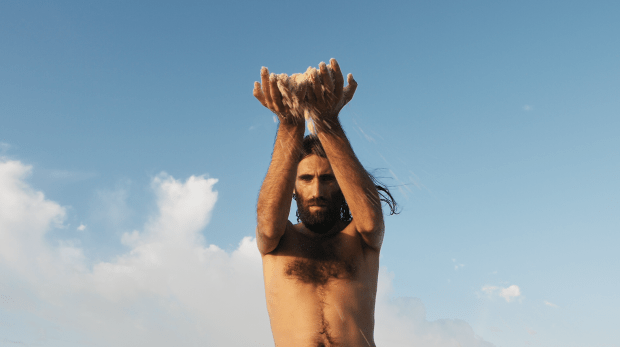 Through staged images, words and poetry, Remain documents the men’s individual and shared stories about violence, hopelessness, suicide, and murder on Manus Island as well as their dreams of freedom (Afshar 2018); drawing attention to the “ramifications of national policy on the human rights of the individual” (University of Queensland Art Museum 2019). Shamindan Kanapadhi, a Sri Lankan Tamil refugee who has been detained on the island for almost five years, describes in the artwork the desperation he has witnessed; how “people have swallowed [razor] blades, drunk shampoo and washing powder” and died of suicide. Kanapadhi’s stark words disrupt the hyper-serenity of the lush green tropical vegetation against which he stands; vegetation which is described elsewhere in Remain as a “green hell”. The contrasts continue as clear blue water laps at a seemingly lifeless body (Figure 1), reminiscent of a pietà, haunting in its lamentation of human vulnerability. In another scene (Figure 2), sand slips through the hands of Behrouz Boochani—a Kurdish–Iranian author who has been detained on Manus Island for five years—emphasising a sense of futility and the desolation of the men’s predicament.